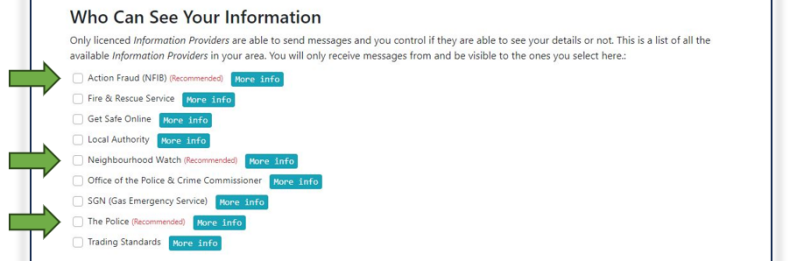 We strongly recommend that you tick the three messaging sources shown (indicated here by green arrows) for Action Fraud, Neighbourhood Watch and The Police as a minimum.